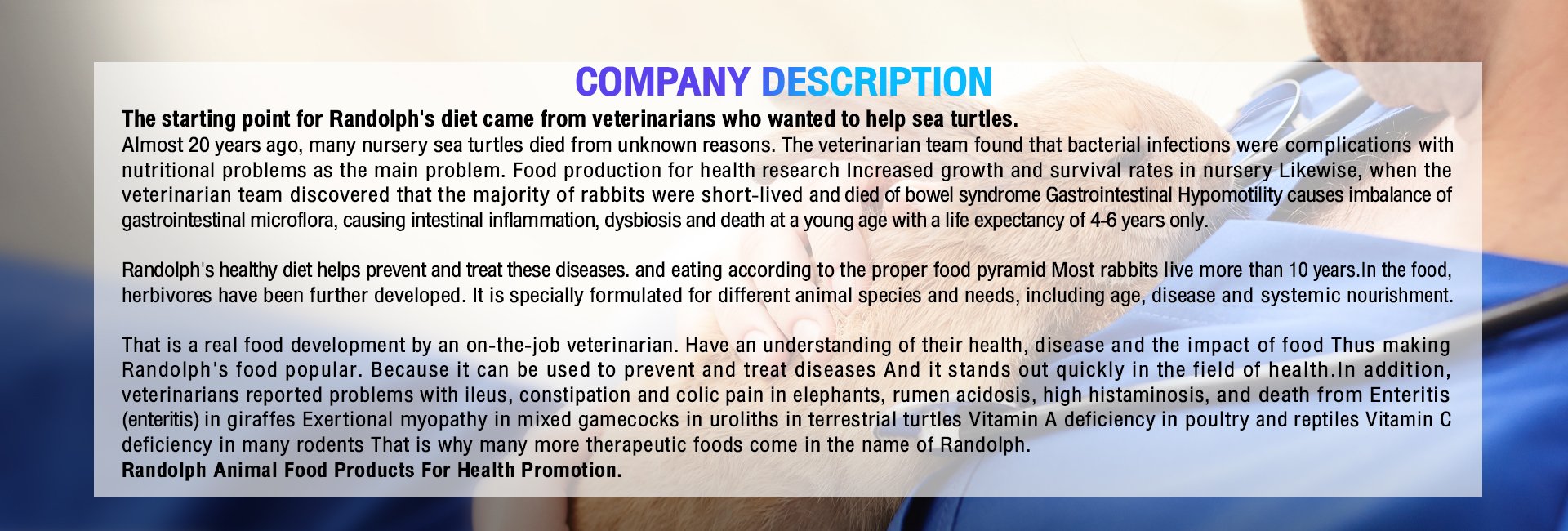 - Randolph Animal Food For Health Promotion. Randolph is a producer of healthy animal feeds and is used for therapeutic purposes.By a team of veterinarians and nutritionists who understand the natural health and needs of animals. We also import high quality raw materials and feeds that suitable for each specific animal.